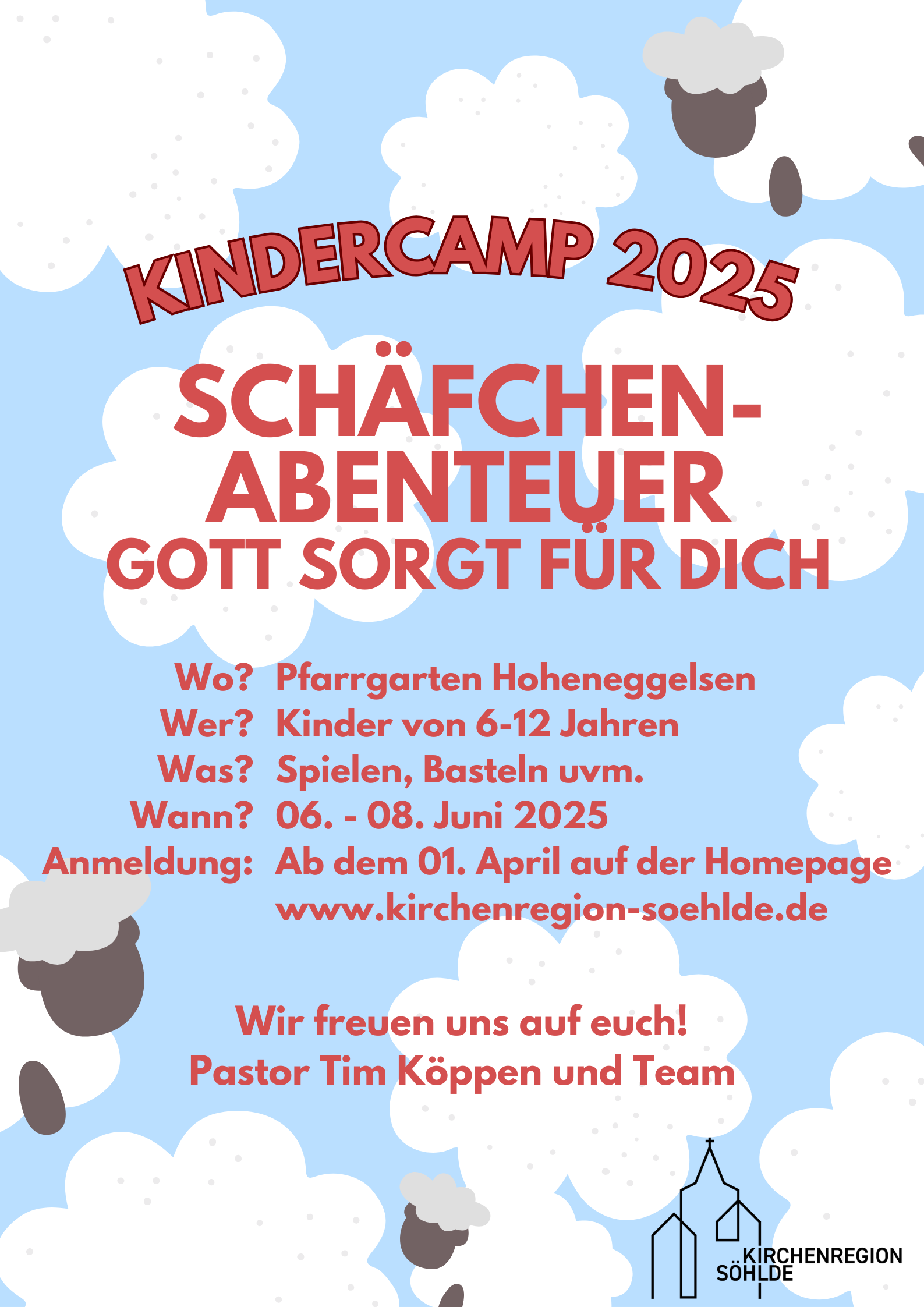 Alle Infos und den Anmeldelink zum Kindercamp 2025 finden Sie auf der Seite der Evangelischen Jugend der Regionen Söhlde und Schellerten. Bitte folgen Sie dem nachstehenden Link!