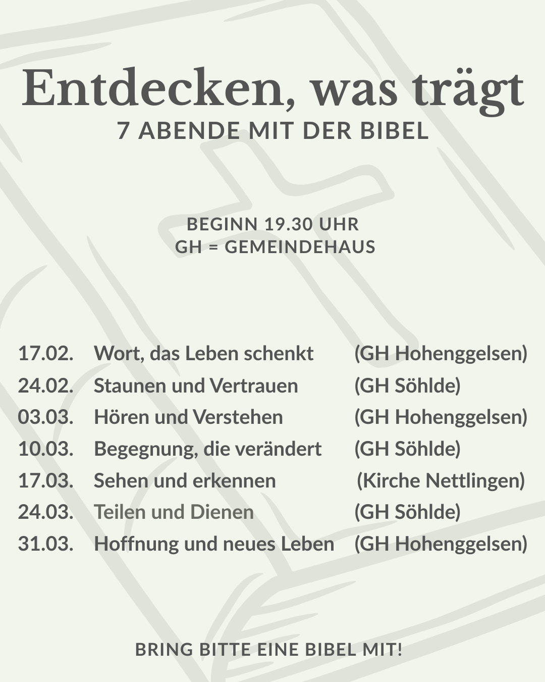 Start ist am Dienstag, 17. Februar, um 19.30 Uhr bis ca. 21.00 Uhr im Gemeindehaus Hoheneggelsen. Danach treffen wir uns wöchentlich.
