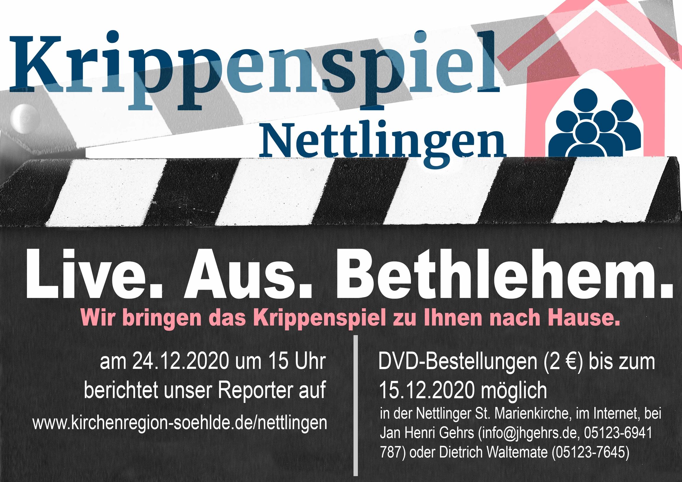 Externen Inhalt anzeigenVerfolgen können Sie die Berichterstattung unseres Reporters am Heiligabend kostenlos im Internet unter www.kirchenregion-soehlde.de/nettlingen um 15 Uhr als Online-Film oder Sie bestellen bis zum 15.12.2020 eine DVD (2,00 Euro).