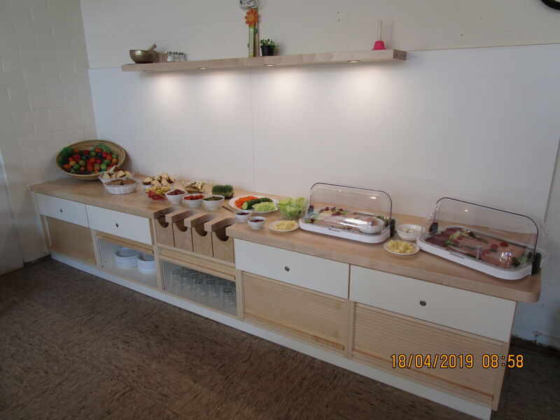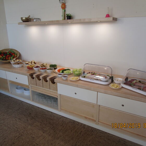 - die Piazza: in diesem Raum treffen wir uns zum Frühstück, zum Mittagessen und am Nachmittag zum Imbiss. Für das Frühstück kaufen wir gemeinsam mit den Kindern ein bzw. werden vom Ökohof aus Sorsum mit frischem Gemüse, Eiern usw beliefert. Jedes Kind lernt, sein Frühstücksbrot selber zu schmieren und zu belegen und kann sich am liebevoll gestalteten Buffet bedienen. Auch das Mittagessen, das uns täglich von der Diakonie Himmelsthür in überwiegend Bio-Qualität geliefert wird, portionieren die Kinder eigenständig am Buffet. Ebenso verfahren wir mit dem Obst und Gemüse am Nachmittag zum Imbiss